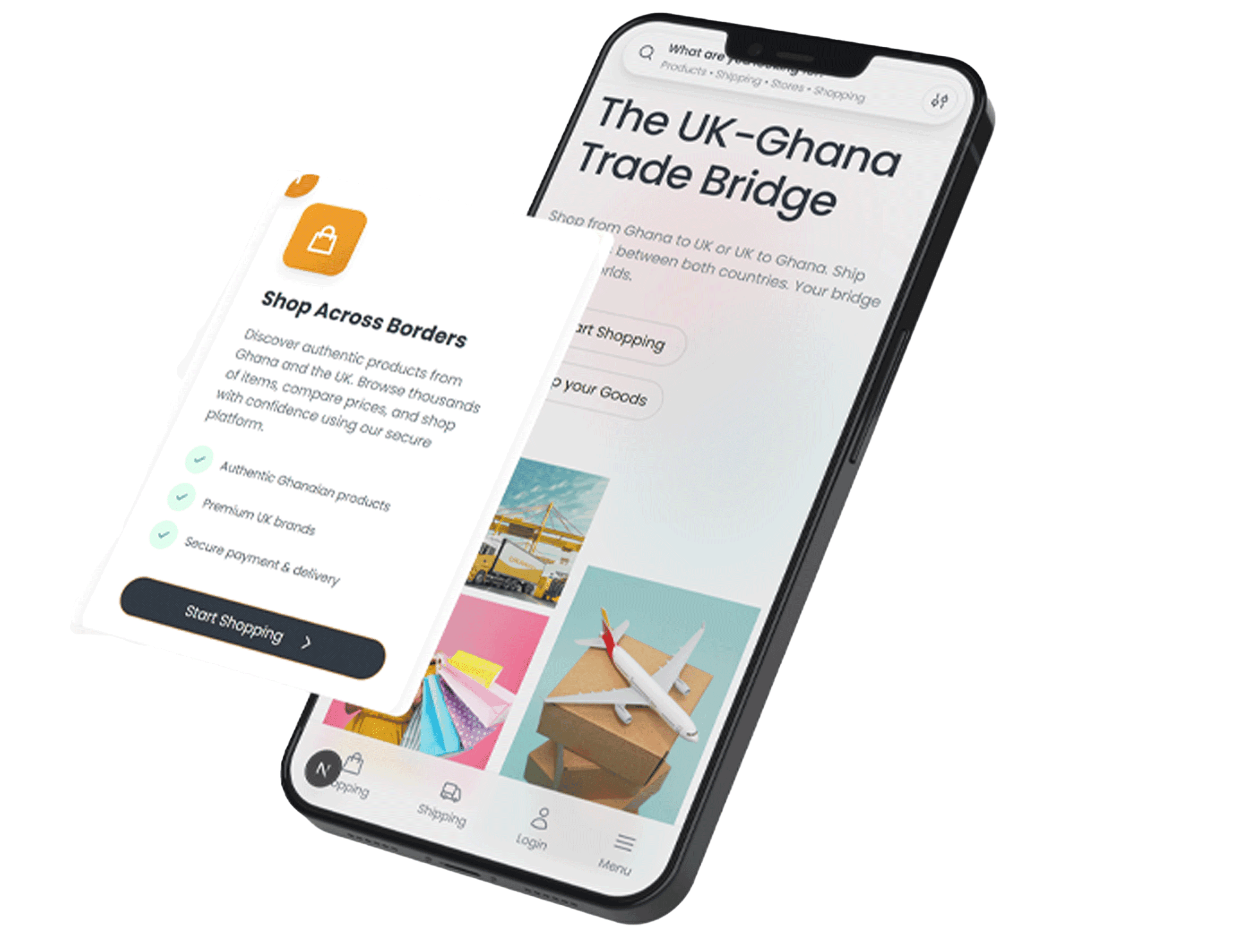 Shop from Ghana to UK or UK to Ghana. Ship your items between both countries. Your bridge to both worlds.